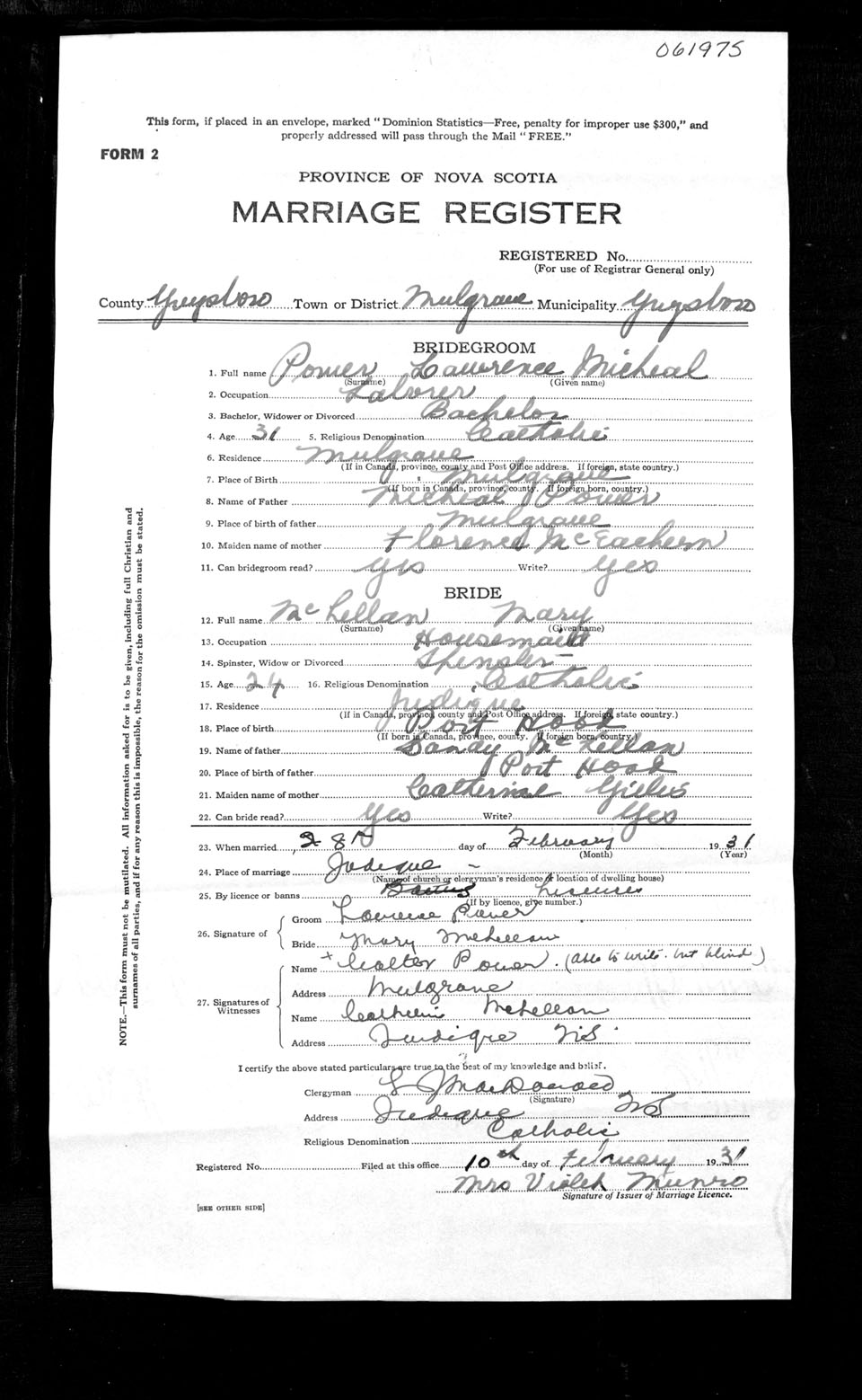 Registration: Year: 1931 number: 61975