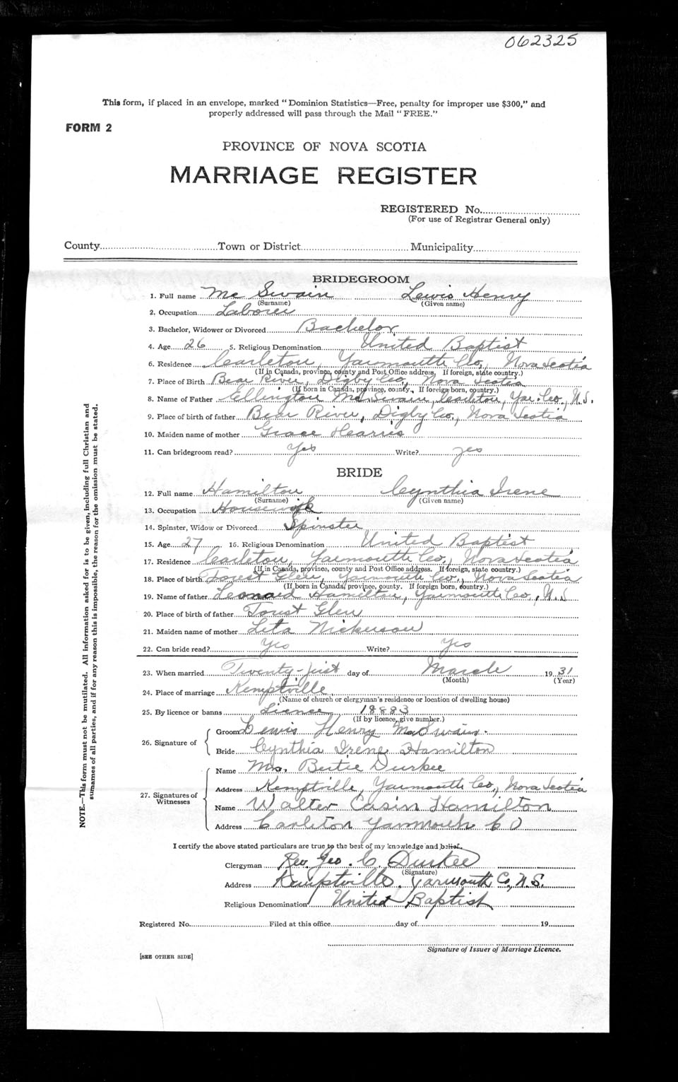Registration: Year: 1931 number: 62325