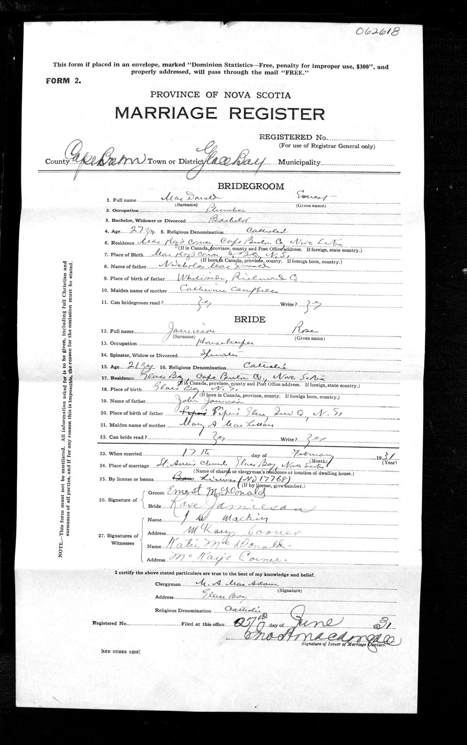 Registration: Year: 1931 number: 62618