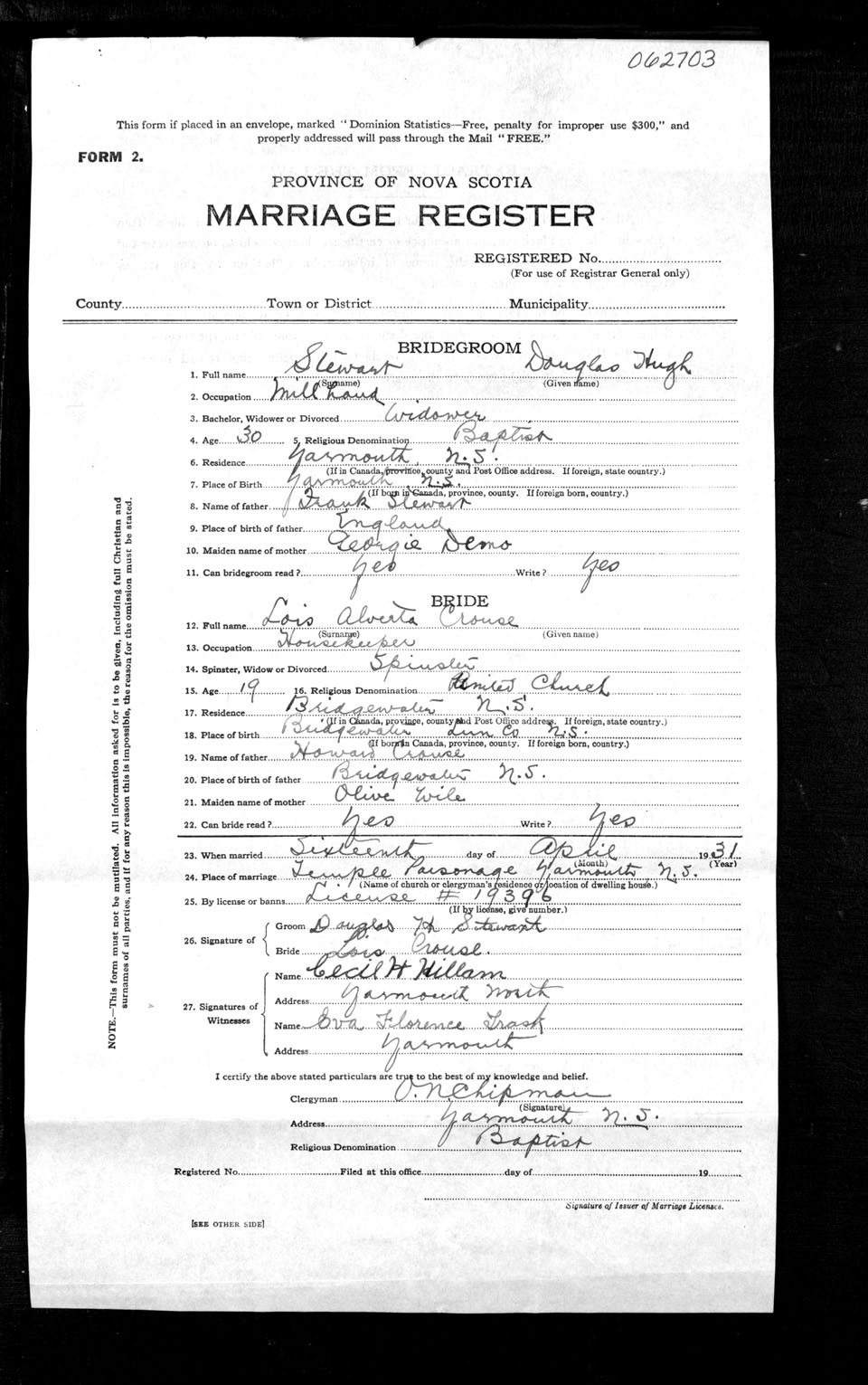 Registration: Year: 1931 number: 62703