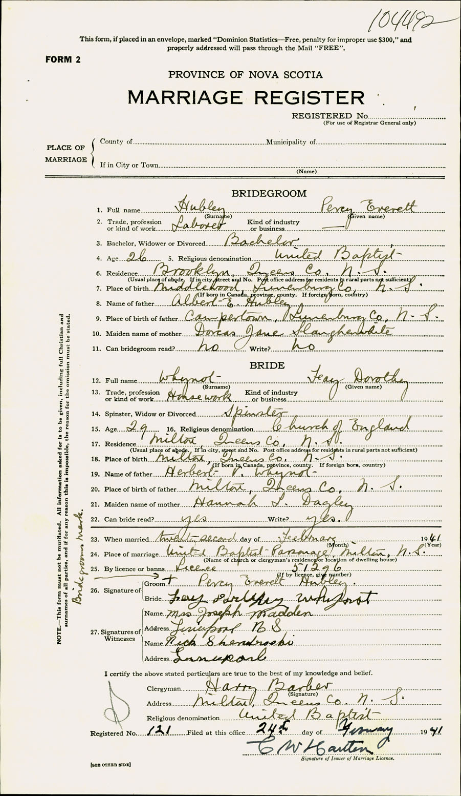 Registration: Year: 1941 number: 104492
