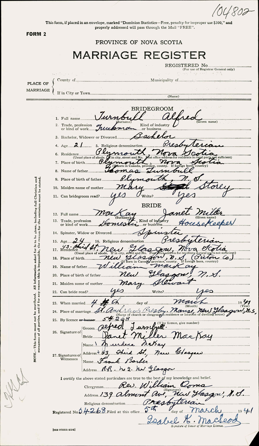 Registration: Year: 1941 number: 104802