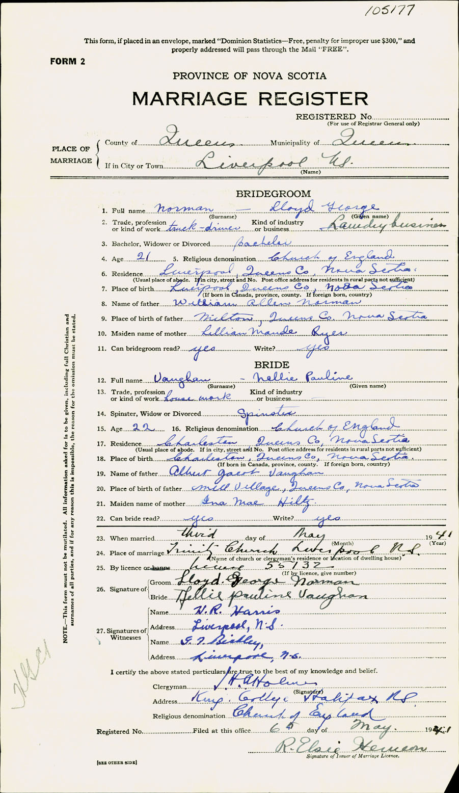 Registration: Year: 1941 number: 105177