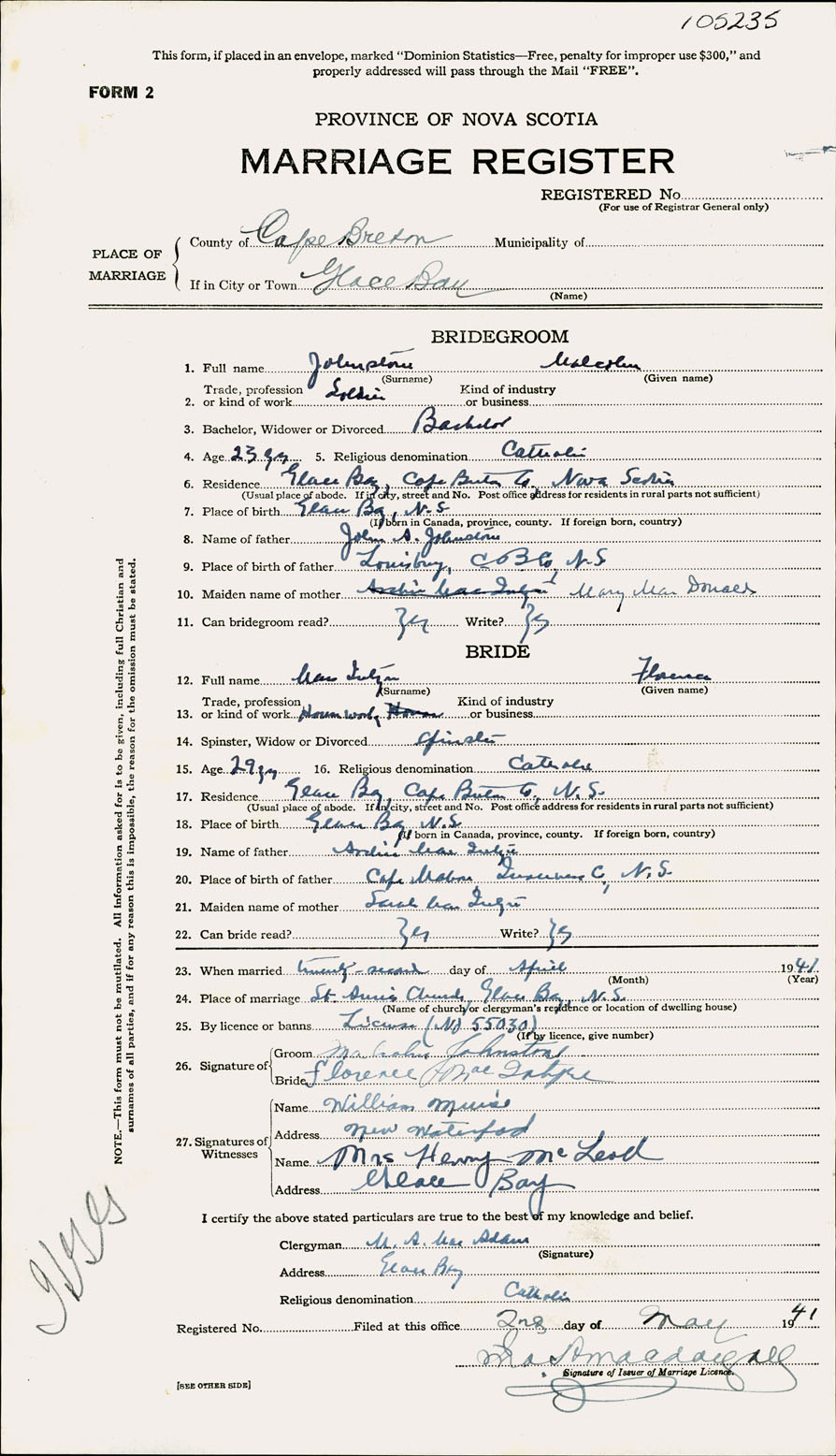 Registration: Year: 1941 number: 105235