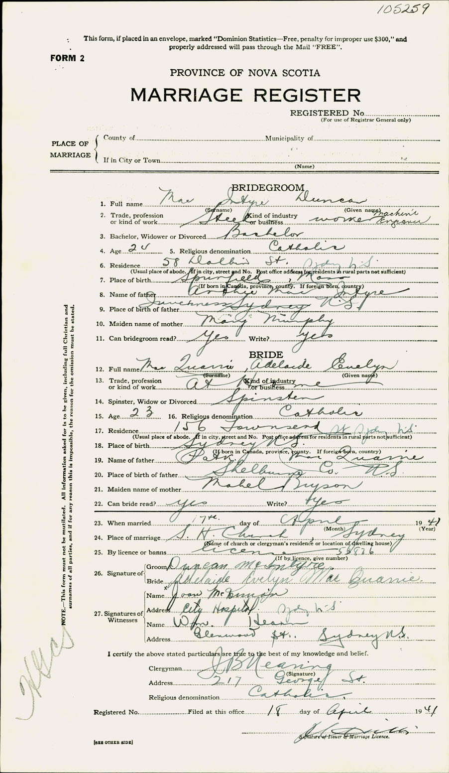 Registration: Year: 1941 number: 105259