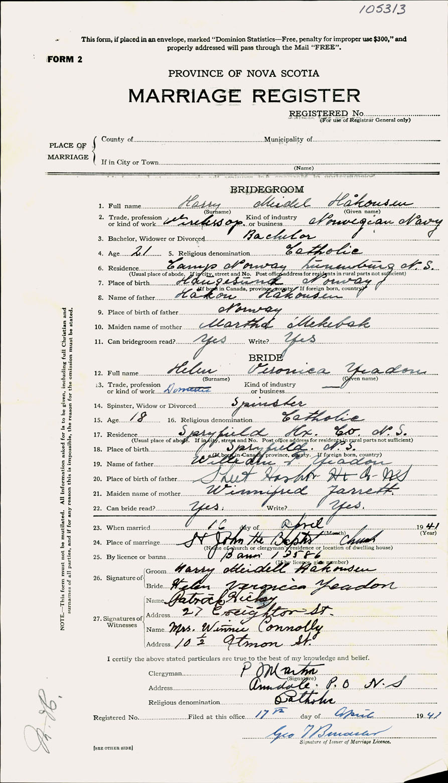 Registration: Year: 1941 number: 105313