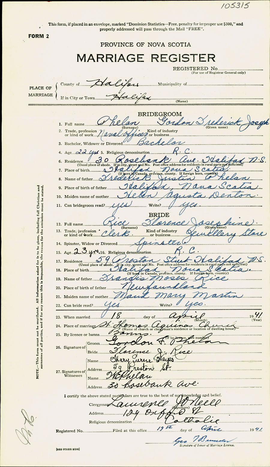 Registration: Year: 1941 number: 105315