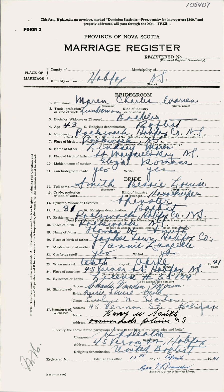 Registration: Year: 1941 number: 105407
