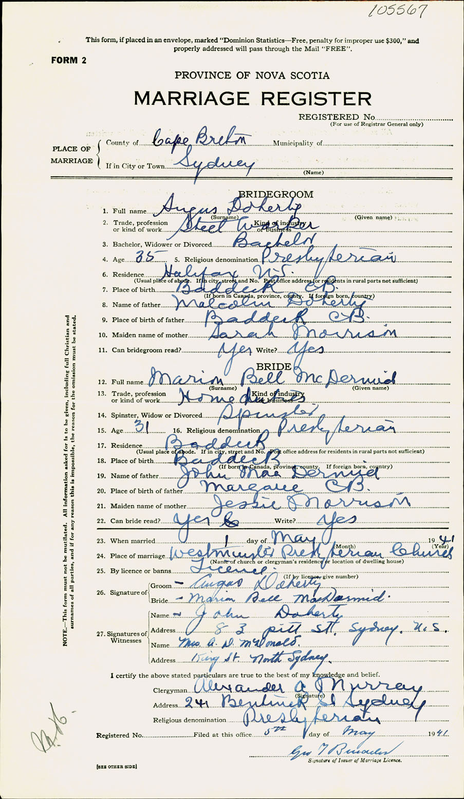Registration: Year: 1941 number: 105567