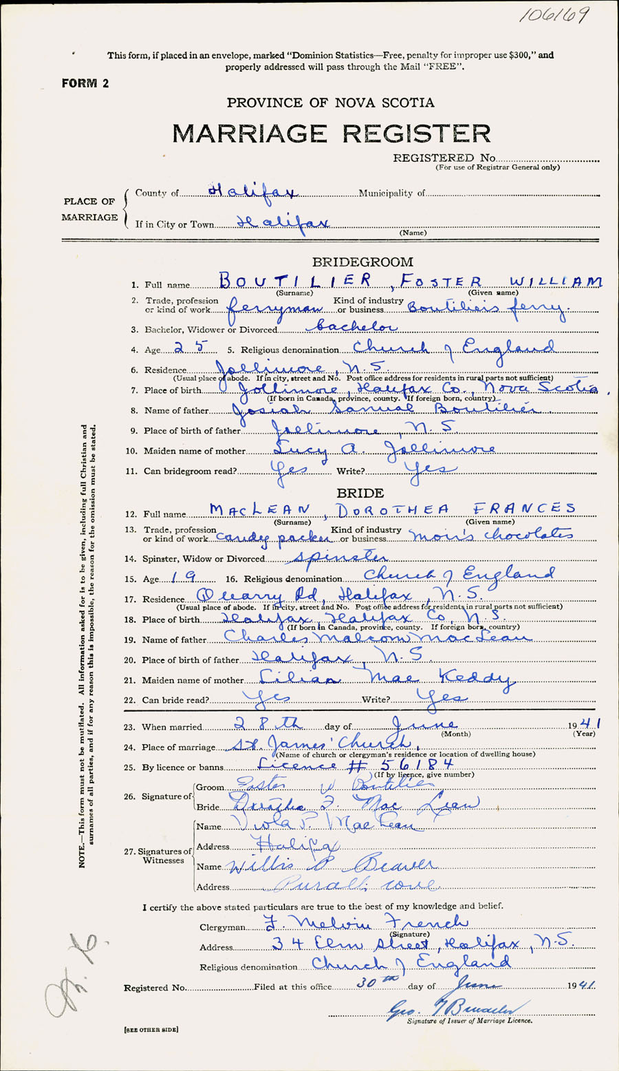 Registration: Year: 1941 number: 106169