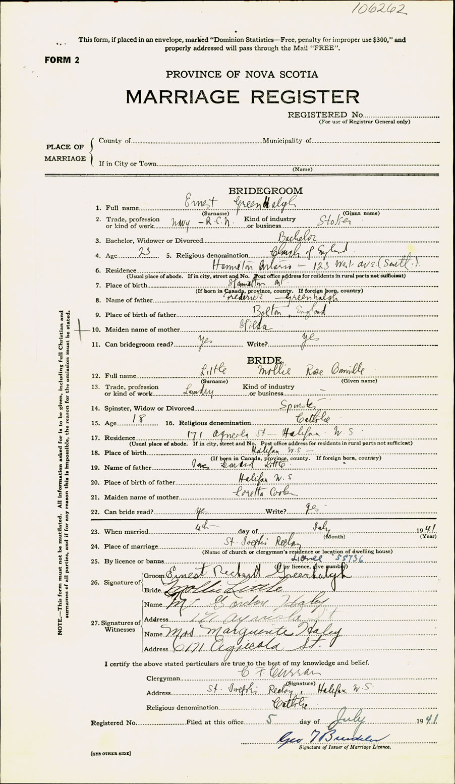 Registration: Year: 1941 number: 106262