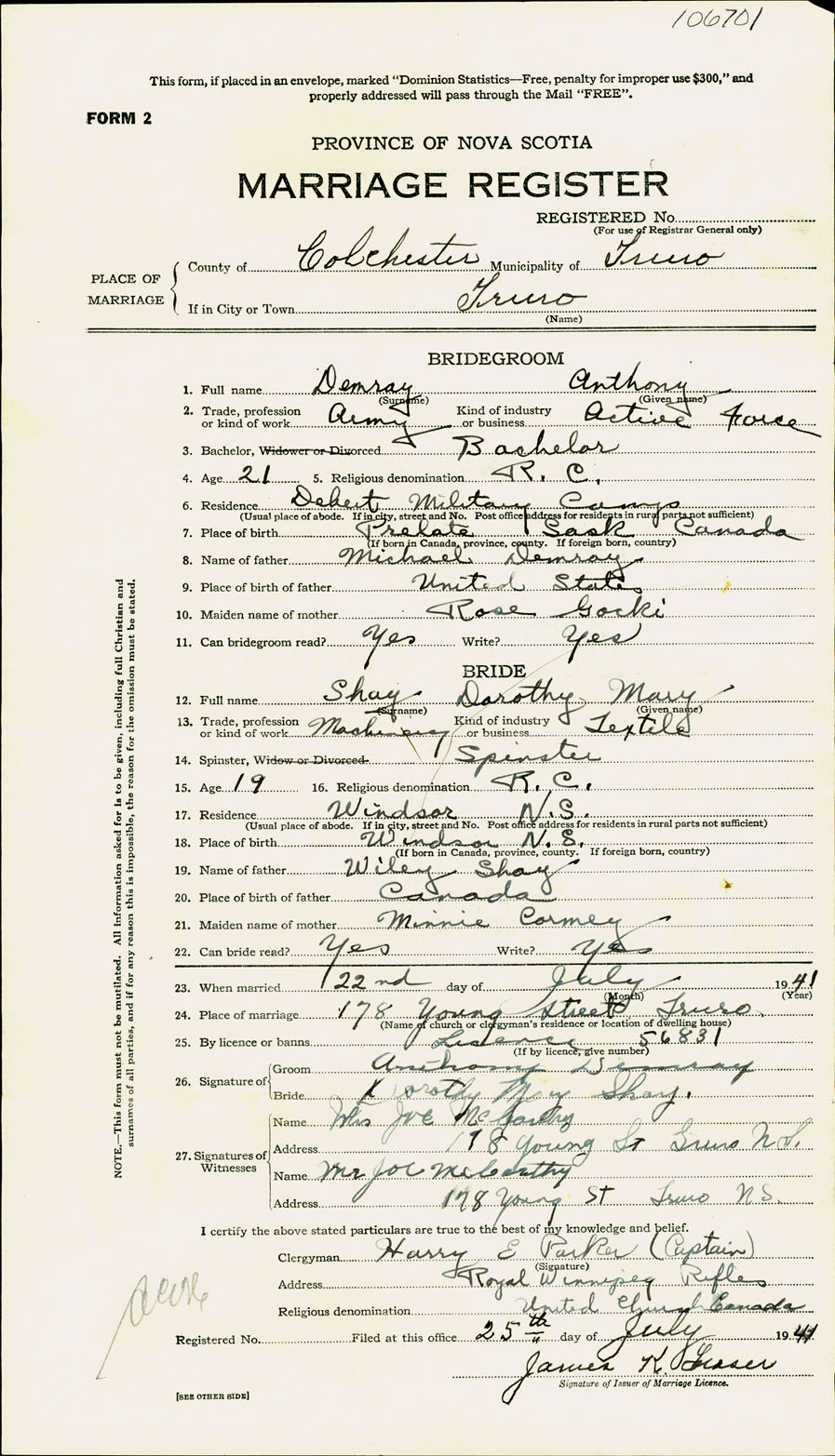 Registration: Year: 1941 number: 106701