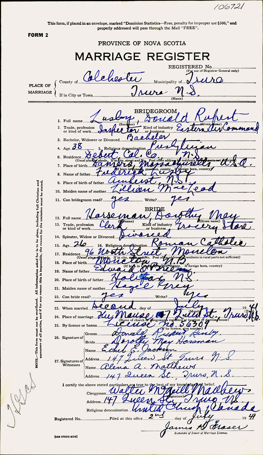 Registration: Year: 1941 number: 106721