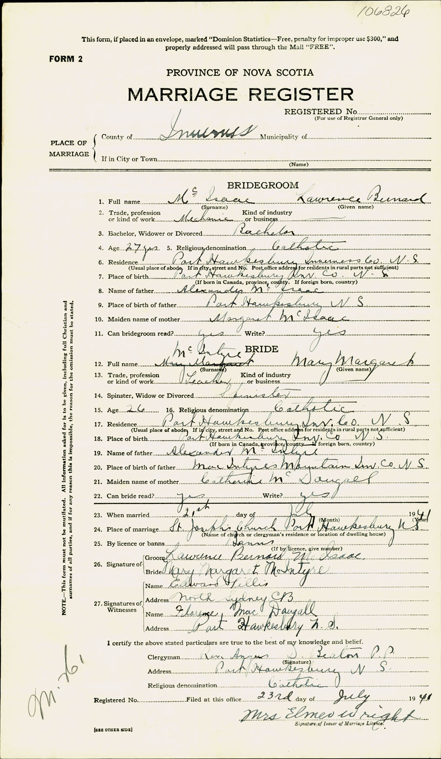 Registration: Year: 1941 number: 106826