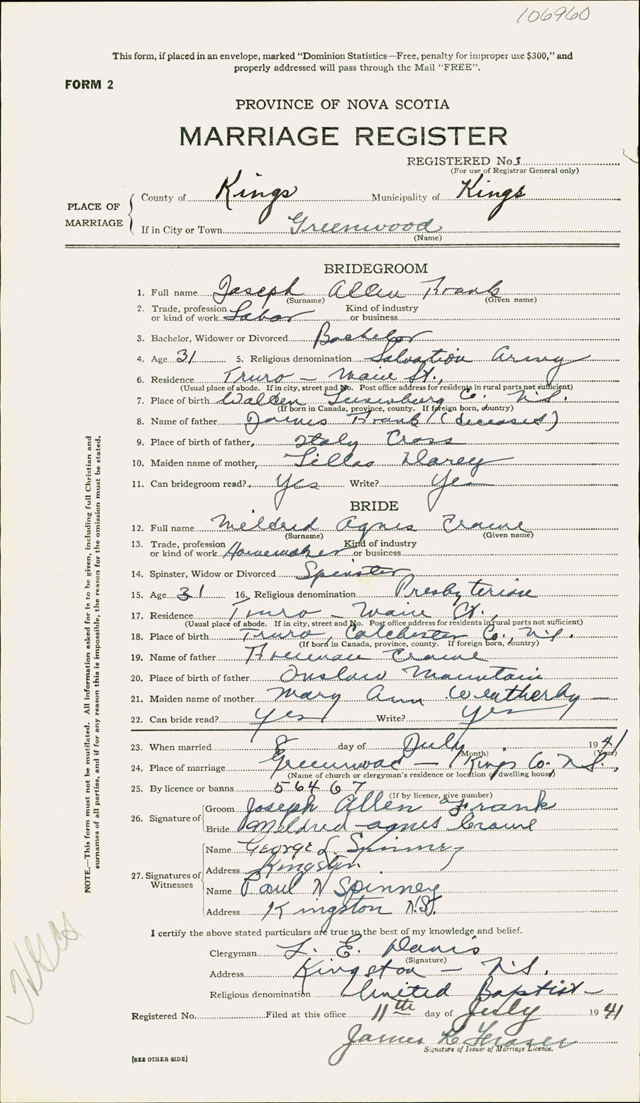 Registration: Year: 1941 number: 106960