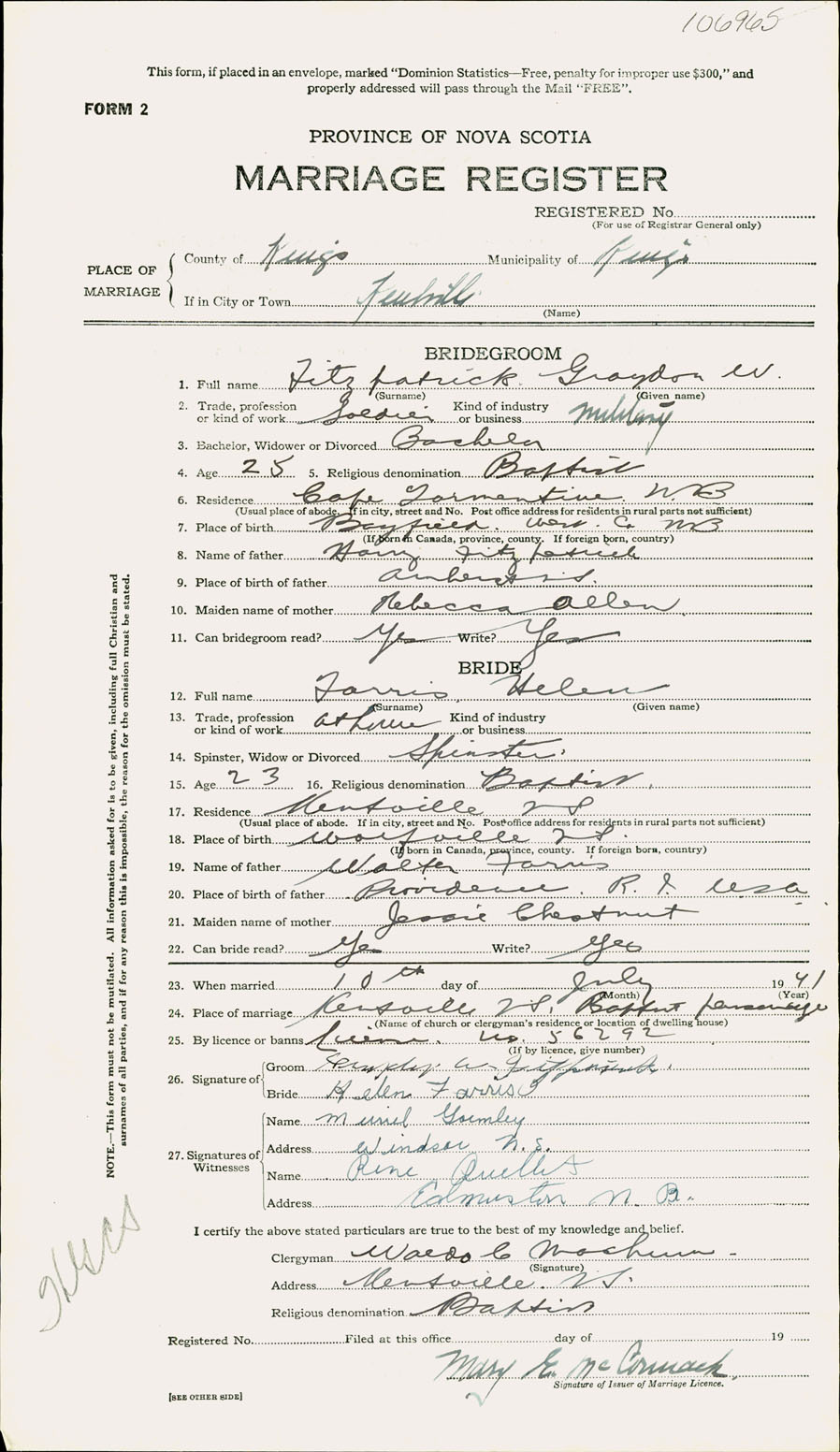 Registration: Year: 1941 number: 106965