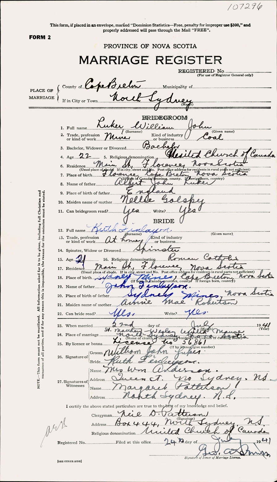 Registration: Year: 1941 number: 107296