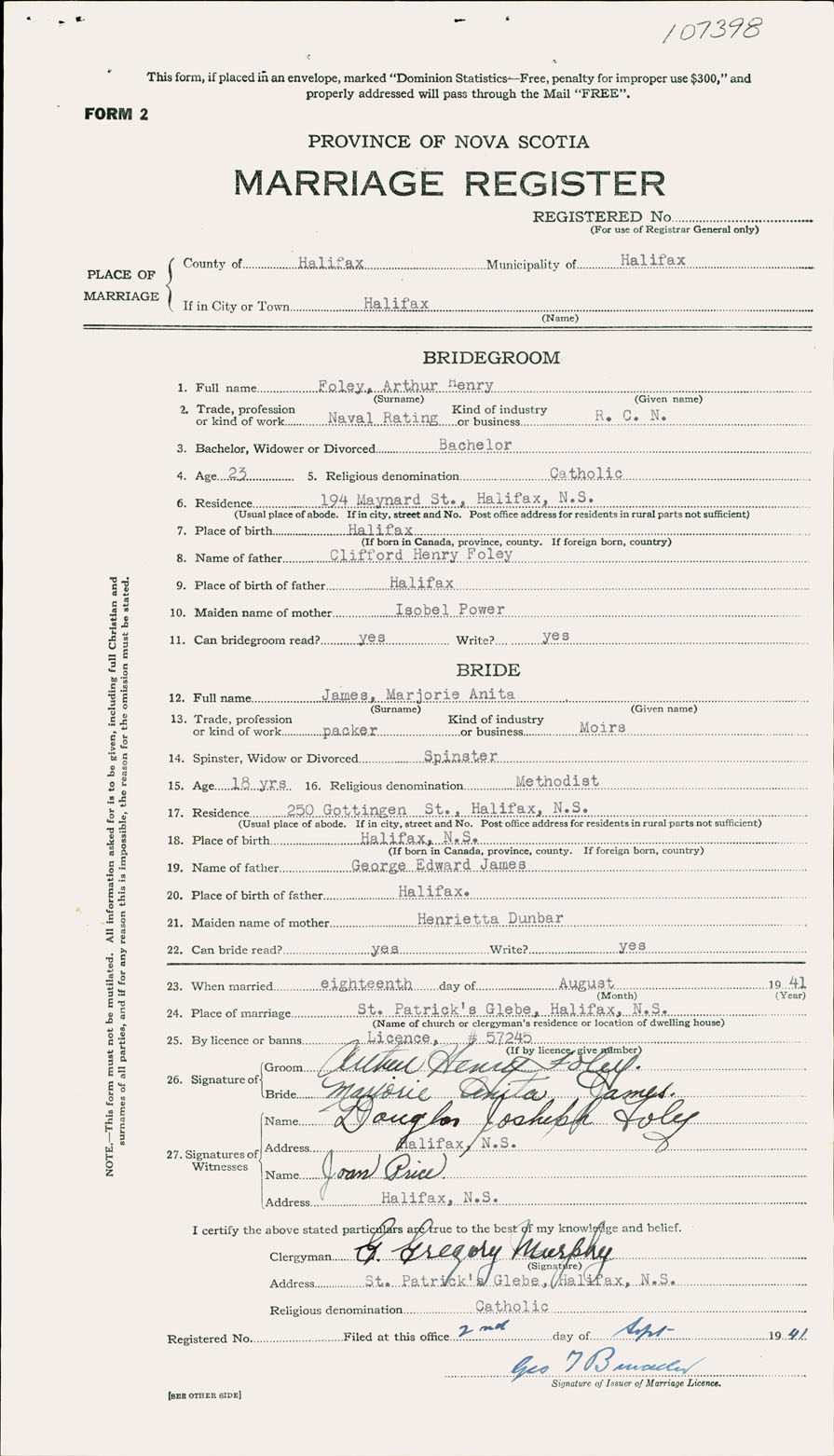 Registration: Year: 1941 number: 107398