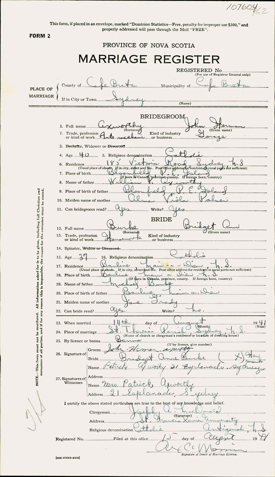 Registration: Year: 1941 number: 107604