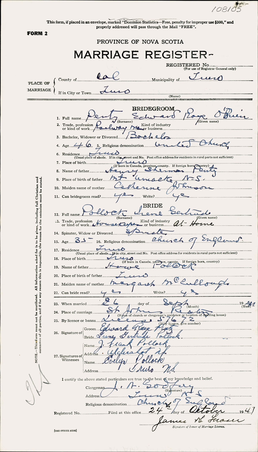 Registration: Year: 1941 number: 108105