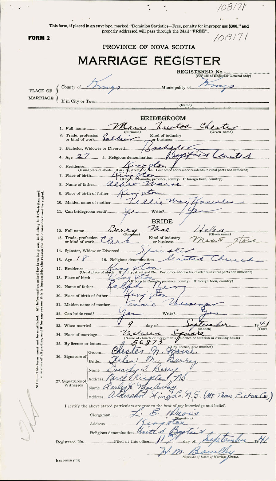 Registration: Year: 1941 number: 108171