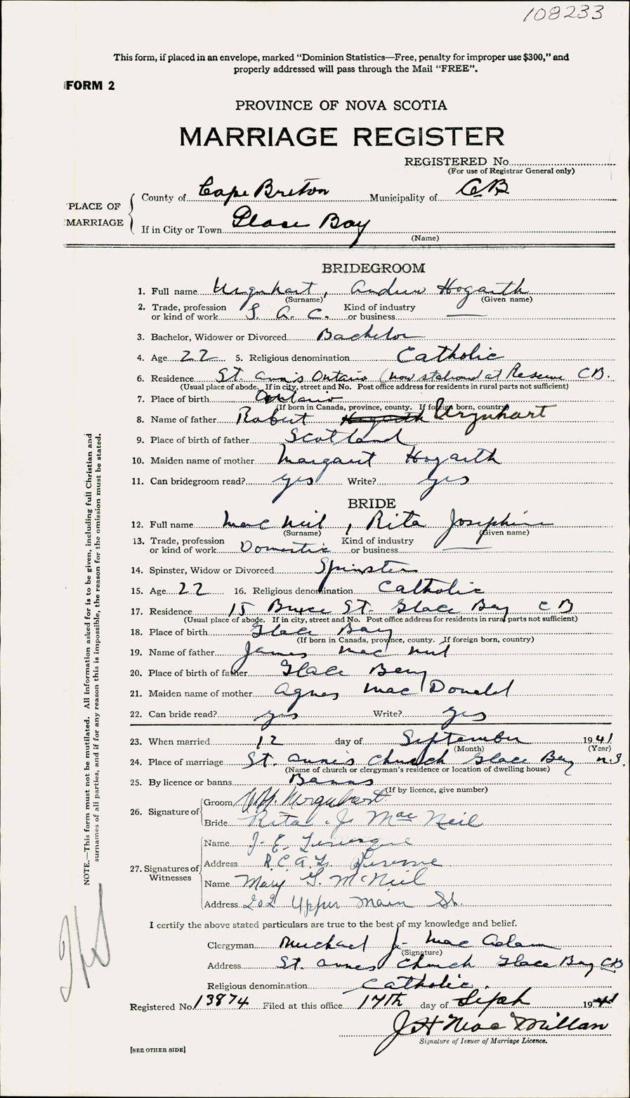 Registration: Year: 1941 number: 108233