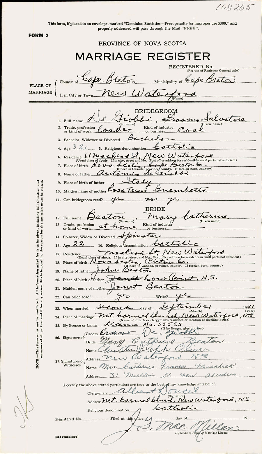 Registration: Year: 1941 number: 108265