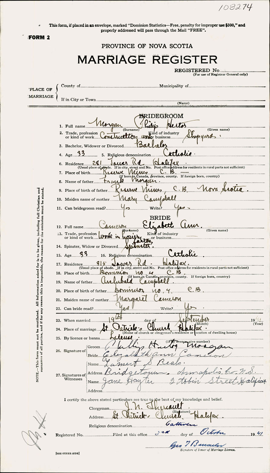 Registration: Year: 1941 number: 108274