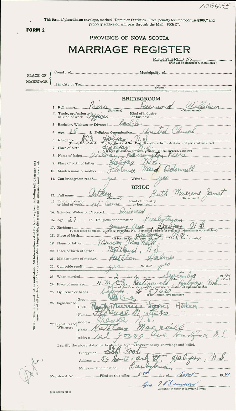 Registration: Year: 1941 number: 108485