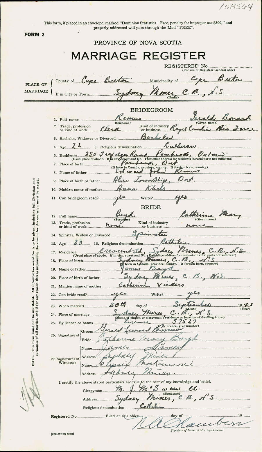 Registration: Year: 1941 number: 108564