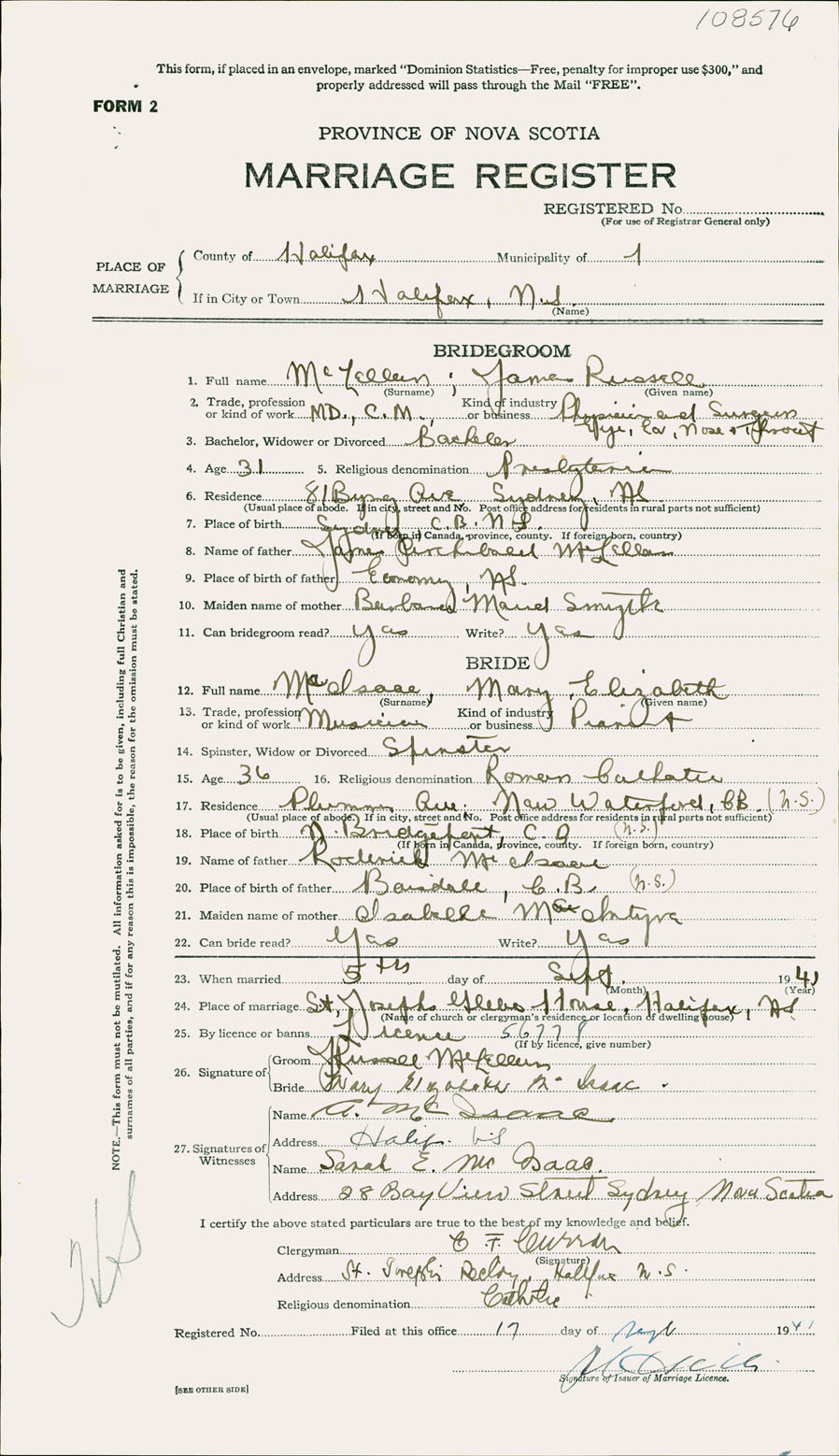 Registration: Year: 1941 number: 108576