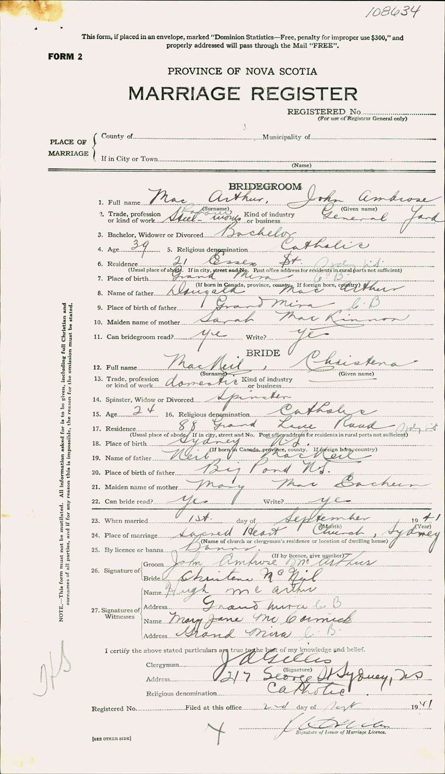 Registration: Year: 1941 number: 108634