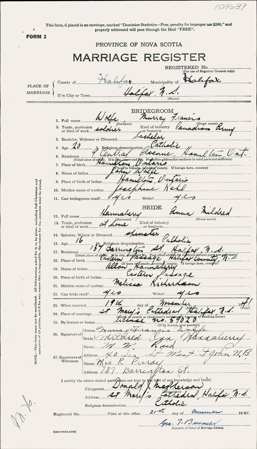 Registration: Year: 1941 number: 109689