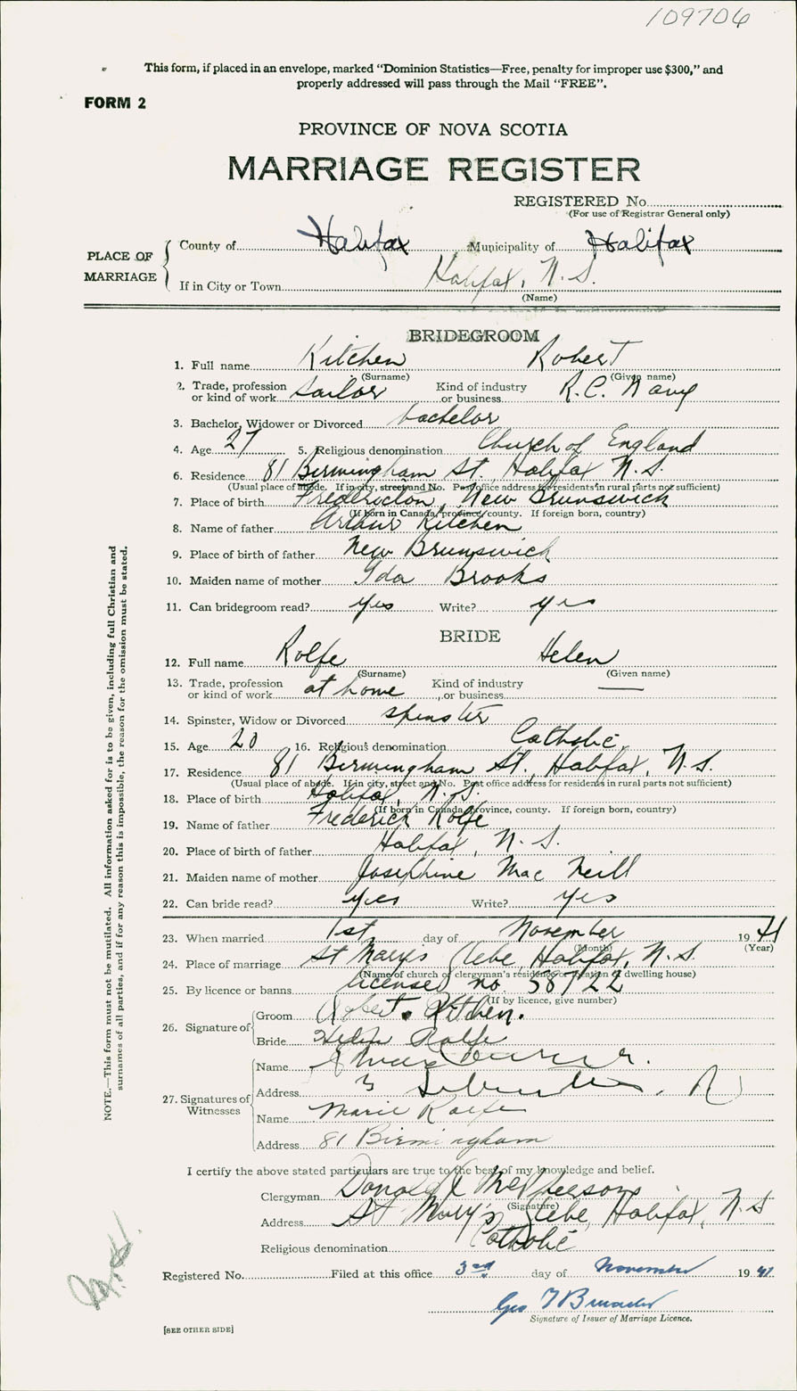 Registration: Year: 1941 number: 109706