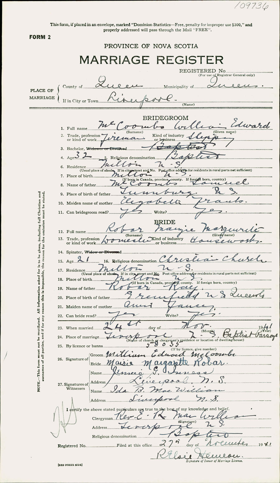 Registration: Year: 1941 number: 109736