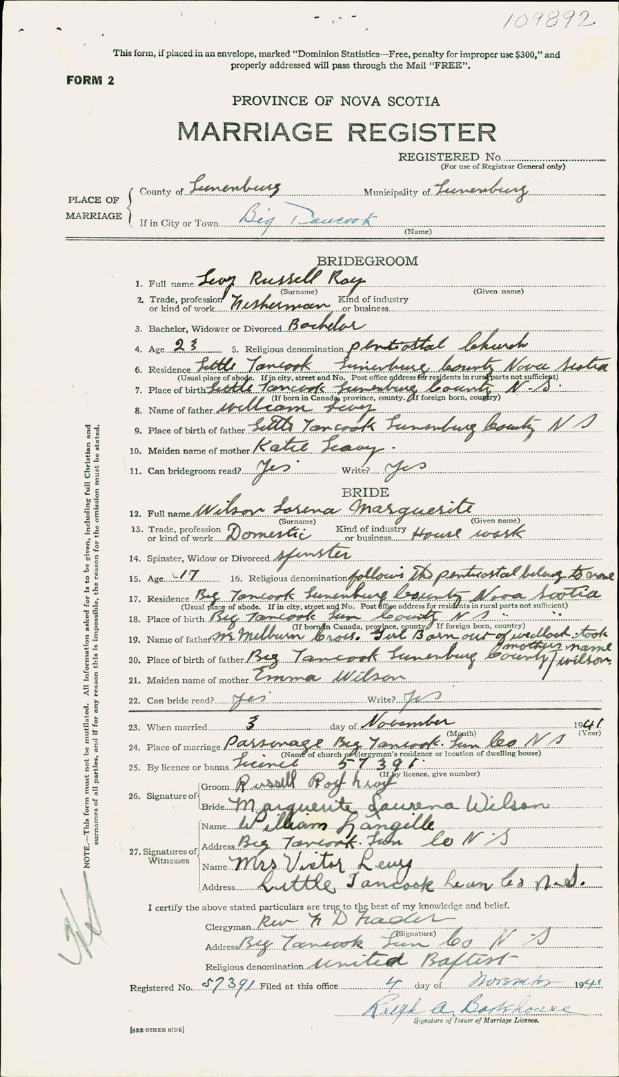 Registration: Year: 1941 number: 109892