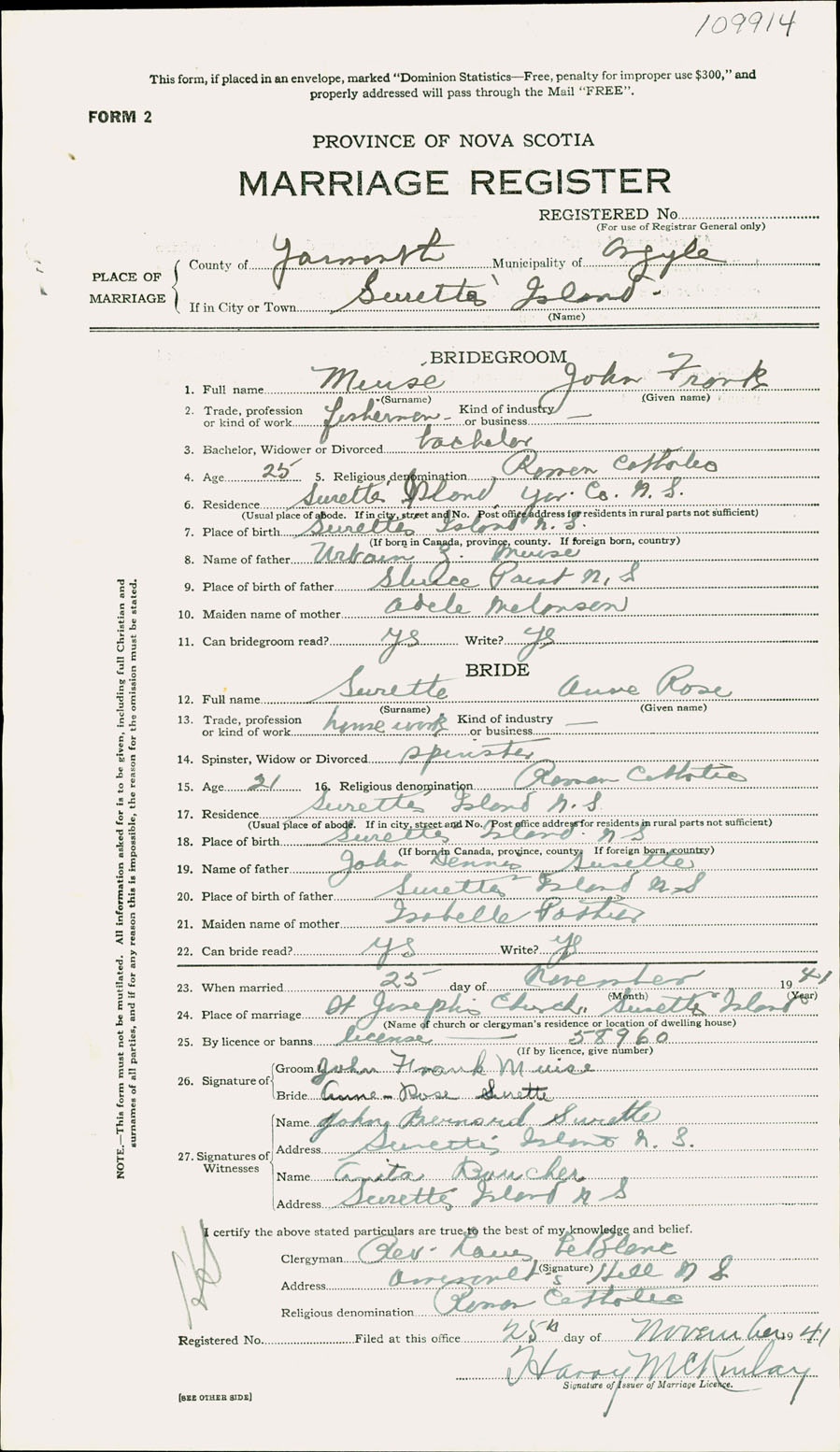 Registration: Year: 1941 number: 109914