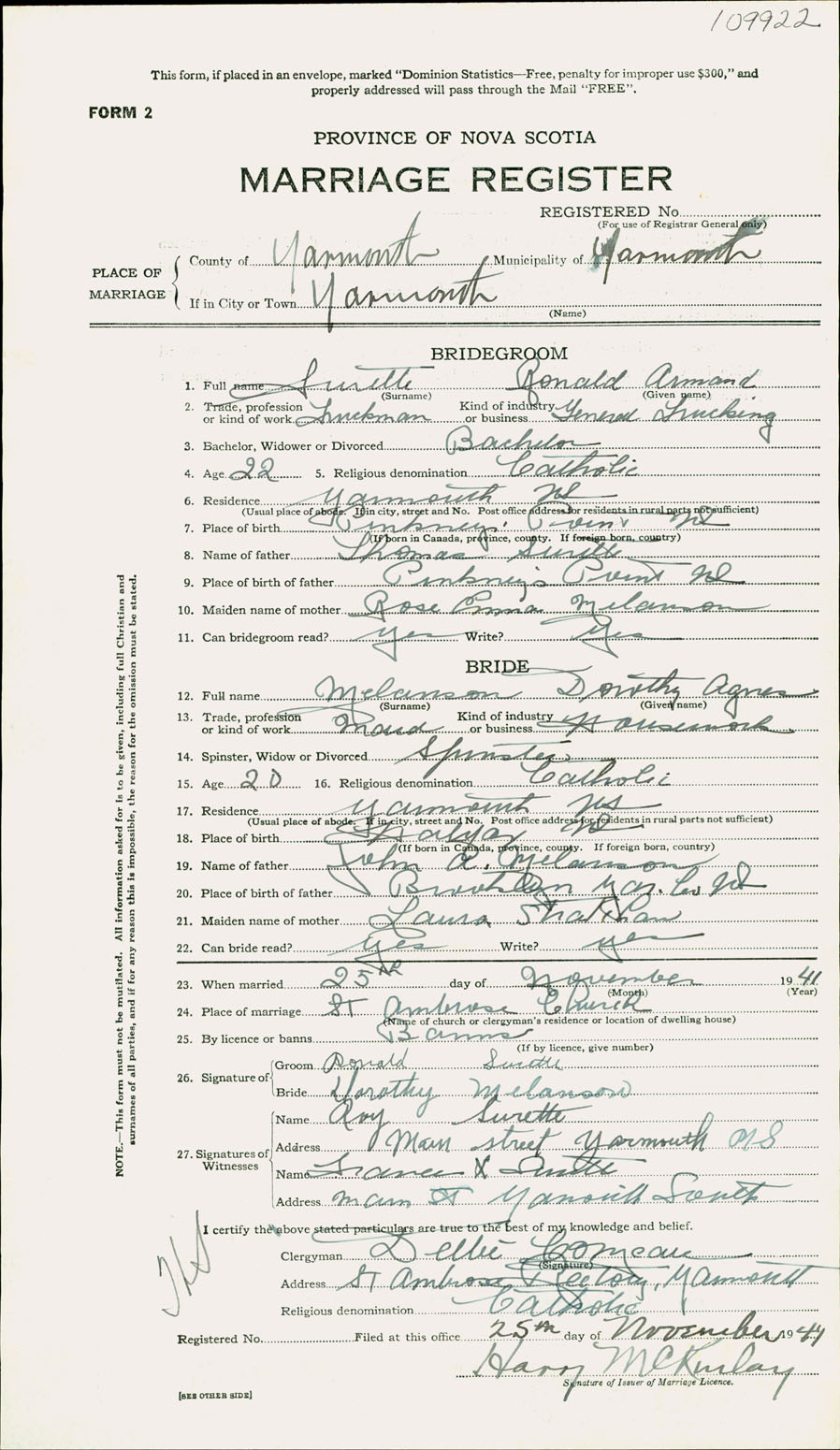 Registration: Year: 1941 number: 109922