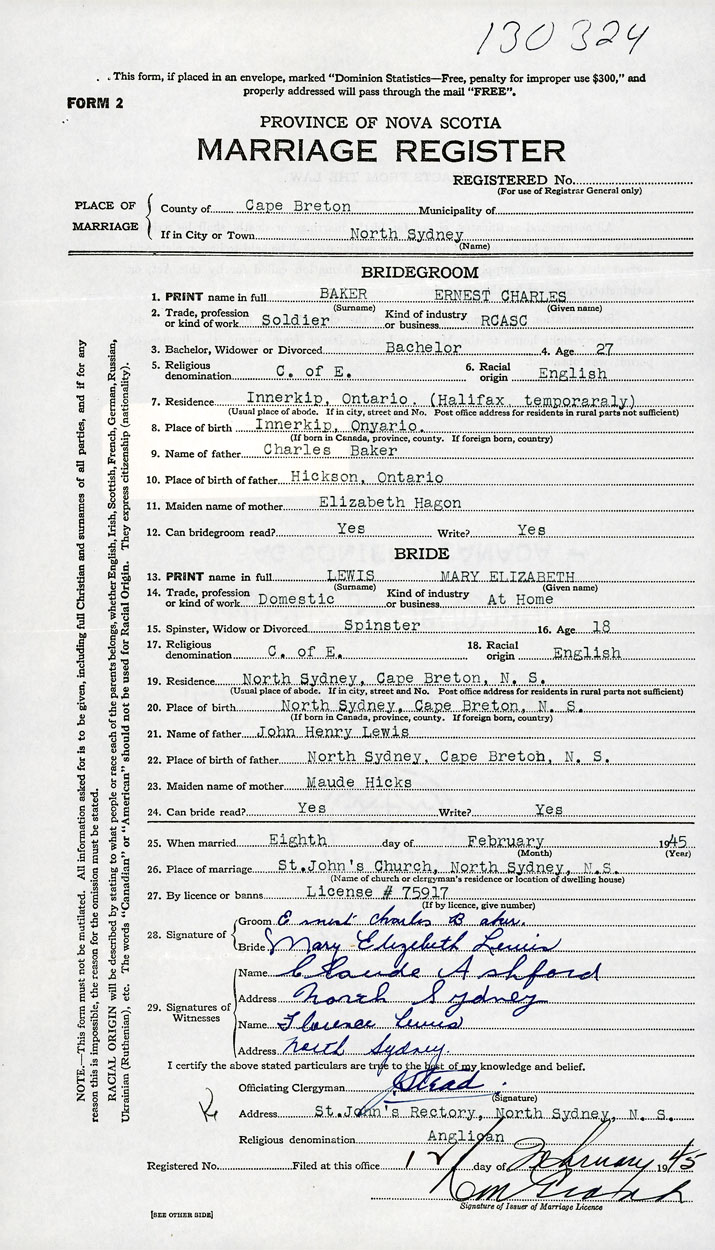 26. Place of marriage St. John's Church North Sydney, Cape Breton County
