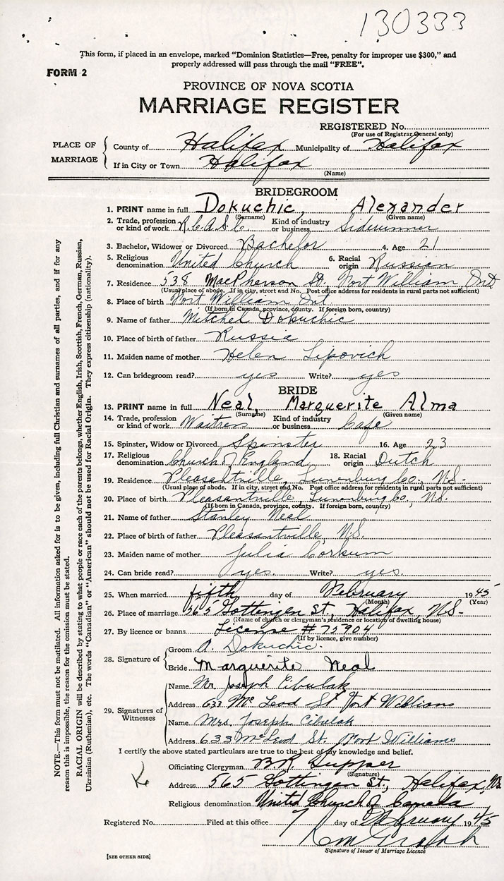 According to a certified copy of the Decree Absolute for Divorce dated 1952-1-23 and filed in the Office of the Registrar General under Divorce number 97, it is ordered that the marriage of Alexander Dokuchic and Marguerite Alma Neal (Registered under marriage number 1945-130333) be null and void.