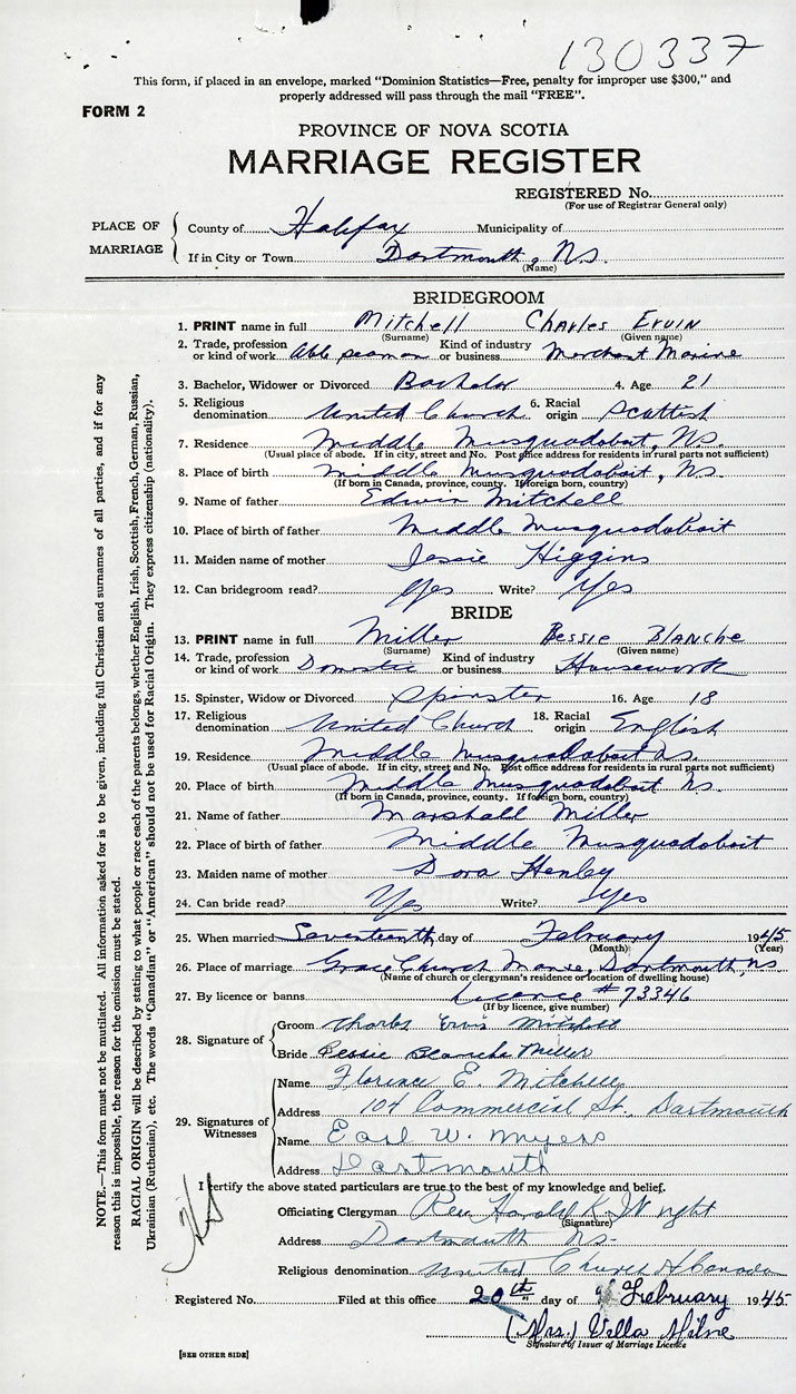 According to a certified copy of the Decree Absolute for Divorce dated 1974-2-25 and filed in the Office of the Registrar General under Divorce number 72-02-001385, it is ordered that the marriage of Charles Ervin Mitchell and Bessie Blanche Miller (Registered under marriage number 1945-130337) be null and void.