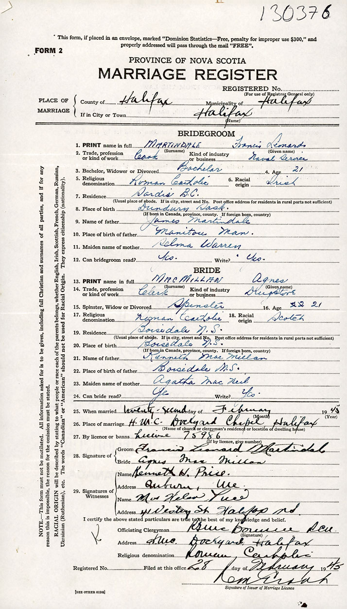 26. Place of marriage H.M.C. Dockyard Chapel Halifax, Halifax County