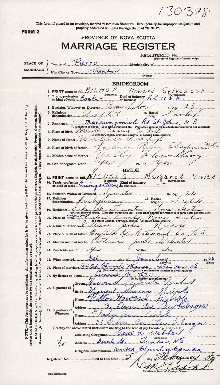 PLACE OF MARRIAGE County of Pictou in City or Town Trenton