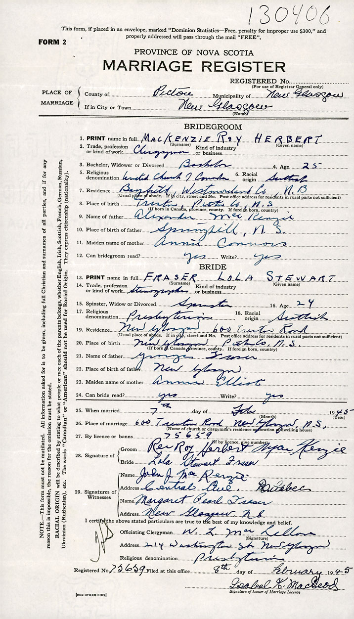 26. Place of marriage 600 Trenton Rd New Glasgow, Pictou County
