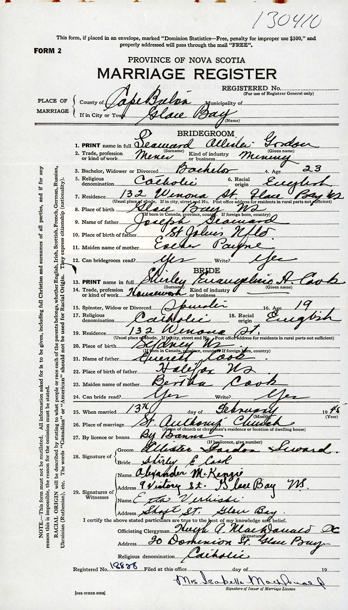 PLACE OF MARRIAGE County of Cape Breton in City or Town Glace Bay