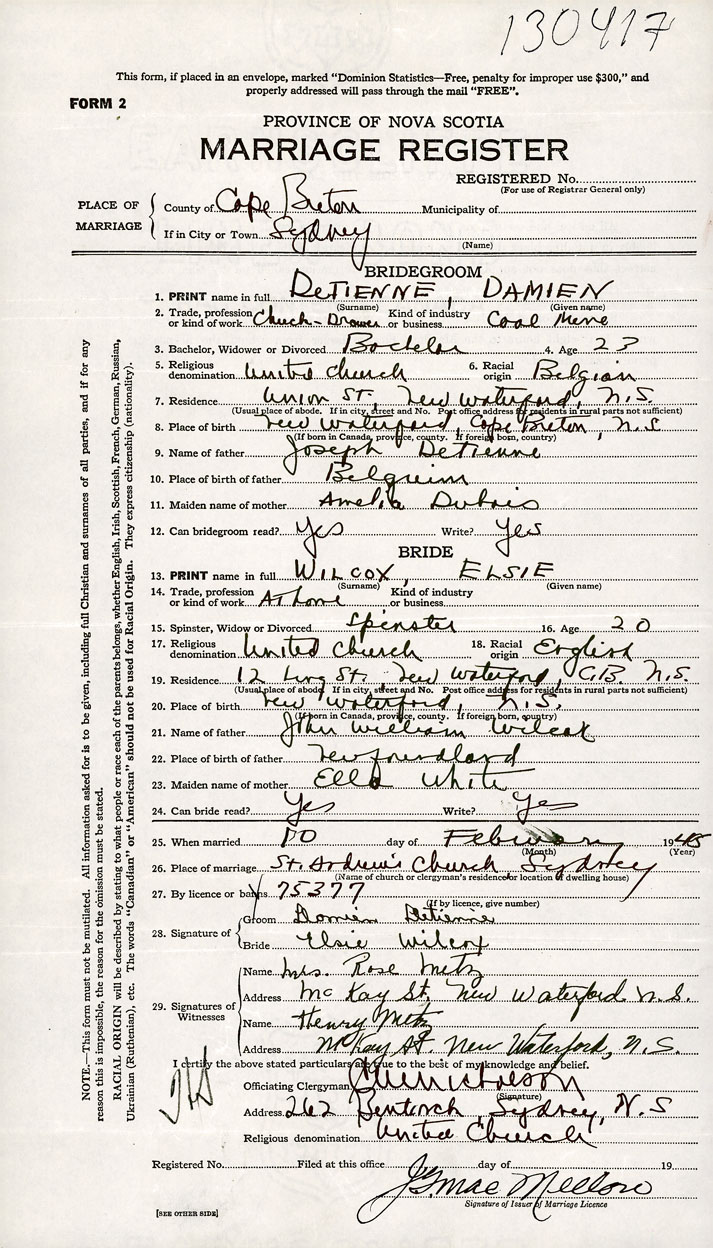 PLACE OF MARRIAGE County of Cape Breton in City or Town Sydney
