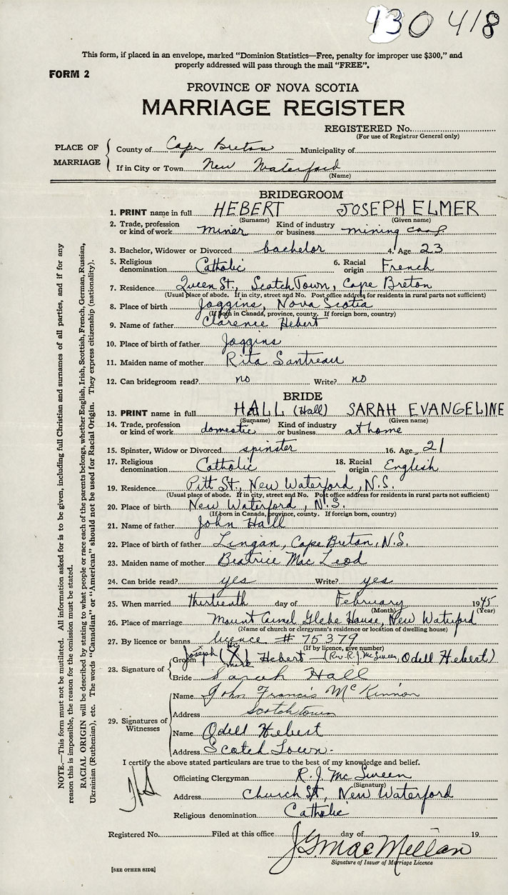 26. Place of marriage Mount Carmel Glebe House New Waterford, Cape Breton County