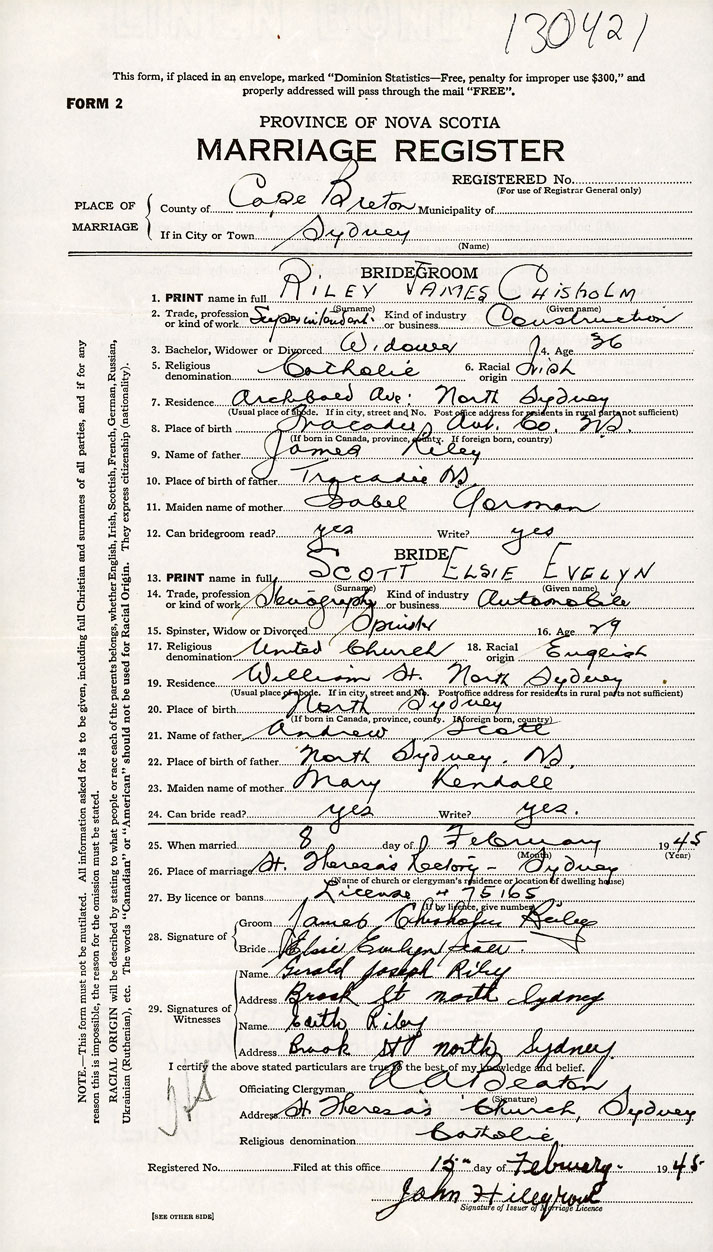 26. Place of marriage St Theresa's Rectory Sydney, Cape Breton County