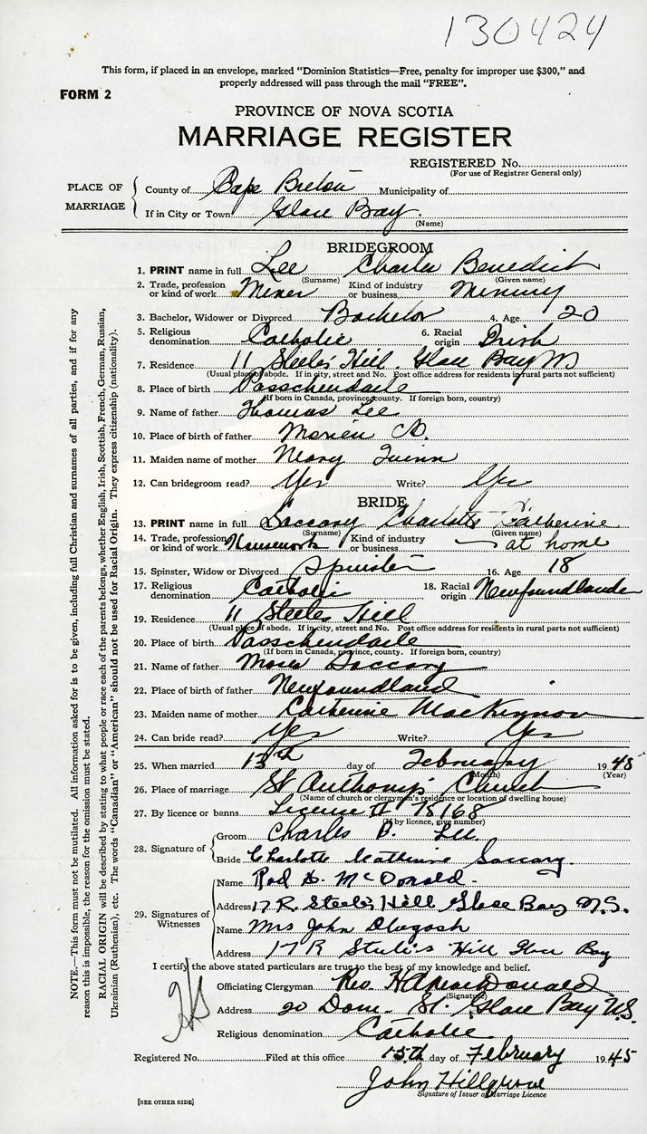 PLACE OF MARRIAGE County of Cape Breton in City or Town Glace Bay