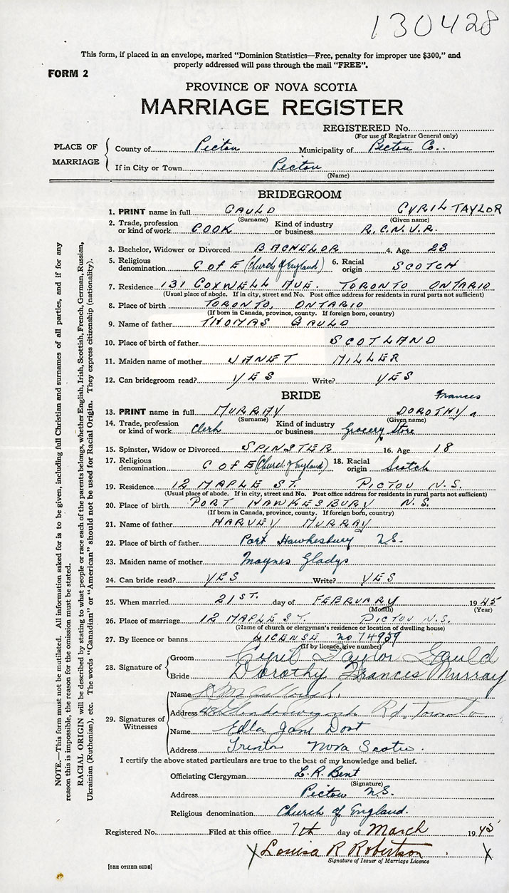 26. Place of marriage 12 Maple St Pictou, Pictou County